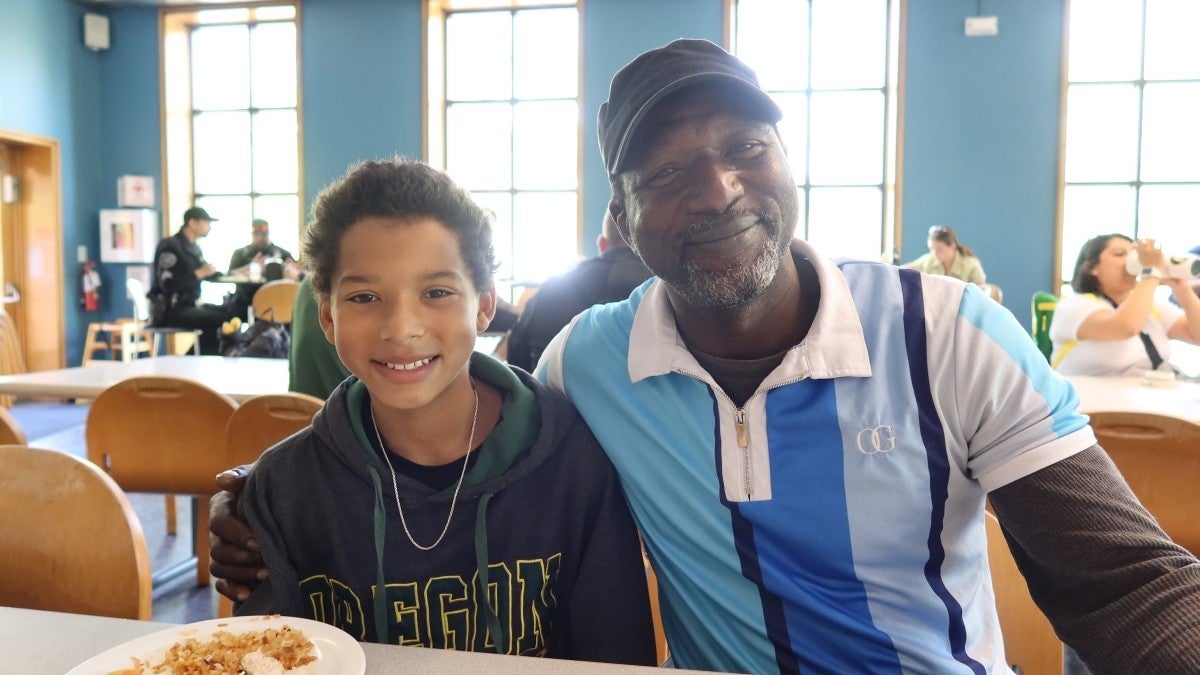 —Top photo: Morie (right) and Tejan Conteh enjoyed lunch and a chat about higher education at the 2025 UO Kids on Campus Day.